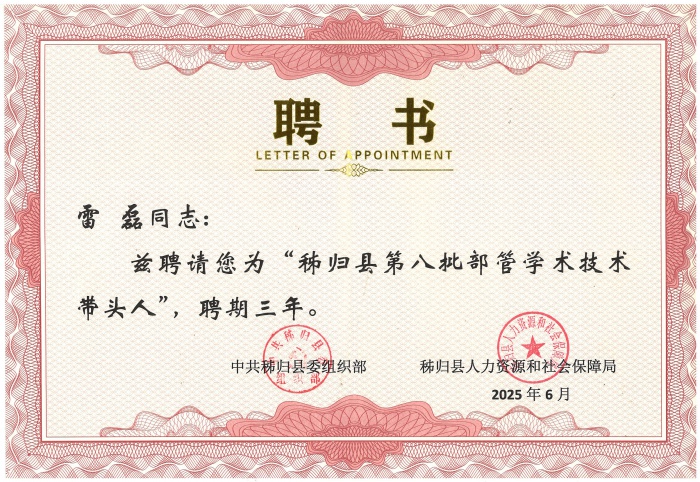 雷磊榮獲秭歸縣第八批部管學(xué)術(shù)技術(shù)帶頭人