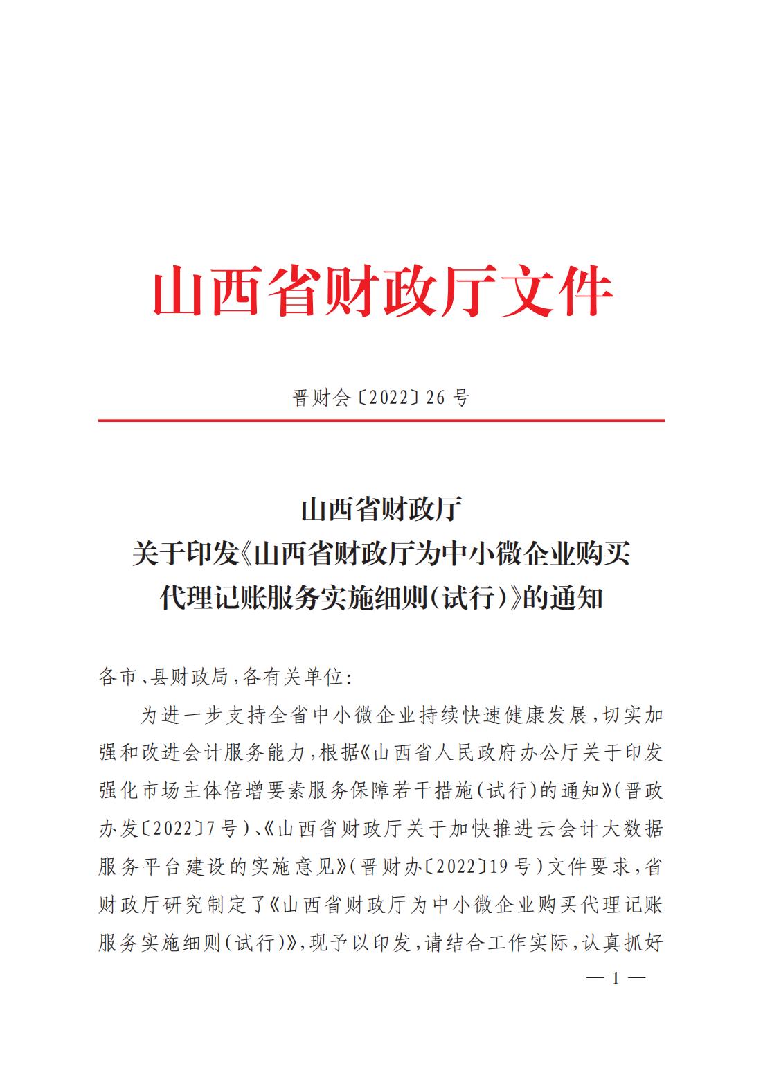 關(guān)于印發(fā)《山西省財政廳為中小微企業(yè)購買代理記賬服務(wù)實施細(xì)則(試行)》的通知