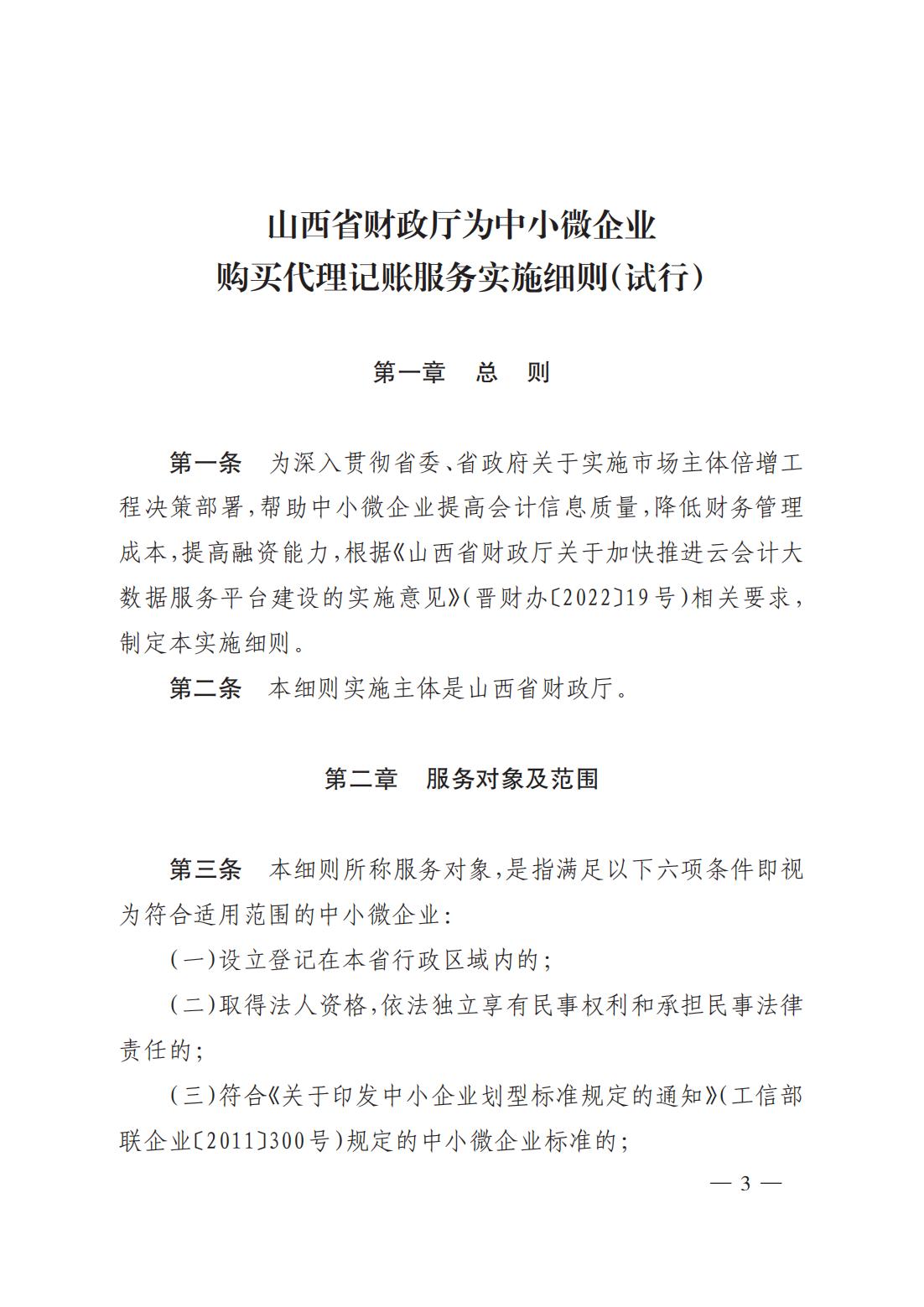 為進(jìn)一步支持全省中小微企業(yè)持續(xù)快速健康發(fā)展,切實加強(qiáng)和改進(jìn)會計服務(wù)能力,根據(jù)《山西省人民政府辦公廳關(guān)于印發(fā)強(qiáng)化市場主體倍增要素服務(wù)保障若干措施(試行)的通知》(晉政辦發(fā)〔2022〕7 號)、《山西省財政廳關(guān)于加快推進(jìn)云會計大數(shù)據(jù)服務(wù)平臺建設(shè)的實施意見》(晉財辦〔2022〕19 號)文件要求,省財政廳研究制定了《山西省財政廳為中小微企業(yè)購買代理記賬服務(wù)實施細(xì)則(試行)》,現(xiàn)予以印發(fā),請結(jié)合工作實際,認(rèn)真抓好貫徹落實。